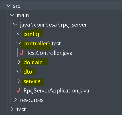 패키지를 위에처럼 종류별로 만들어주고, 통신 테스트를 위해 controller > test 안에 testController.java를 만들었다.